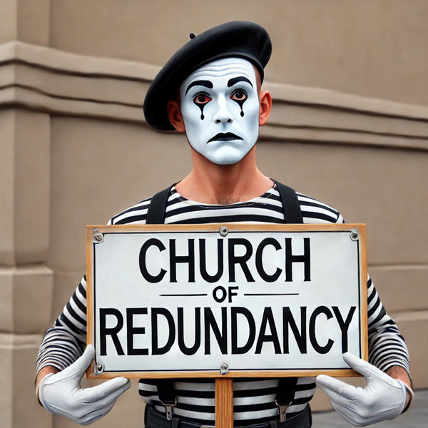 Mime enters with a sign. The mime will hold the sign throughout the piece and should stand in a strong second position (legs apart). The sign reads, "Church of Redundancy."