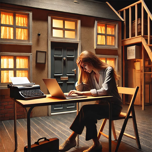 Anne comes on stage with laptop in hand, mumbling to herself, typing into laptop