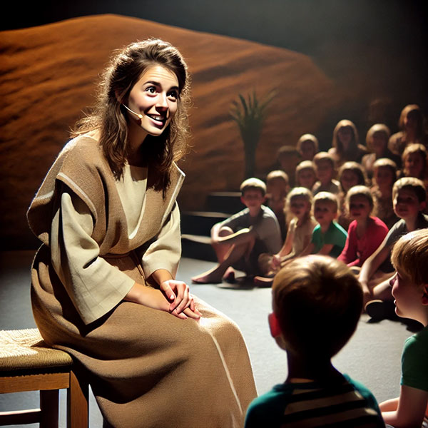 - She must "stay in character" at all times but should engage with the congregation by looking around as she speaks to the children.