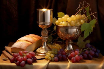 Eucharist, celebration of communion, elements: bread, cup.